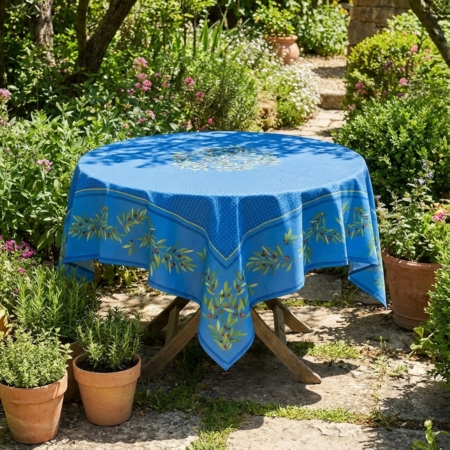 Beschichtete Baumwolle Provence Tischdecke BLAU Ø 175 cm mit Olivenzweigen