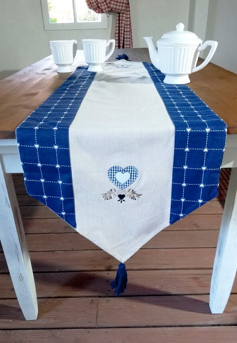 Entdecken Sie den charmanten Tischläufer mit Leinen im Landhausstil aus dem malerischen Elsass, der Ihrem Essbereich eine besondere Note verleiht.