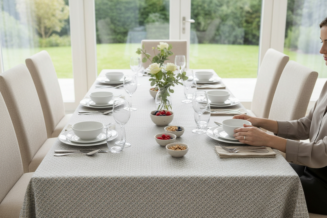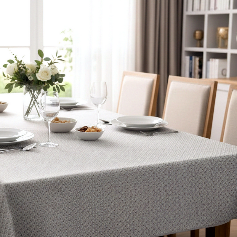 Diese moderne Tischdecke aus pflegeleichtem Polyester verbindet Stil mit Alltagstauglichkeit.