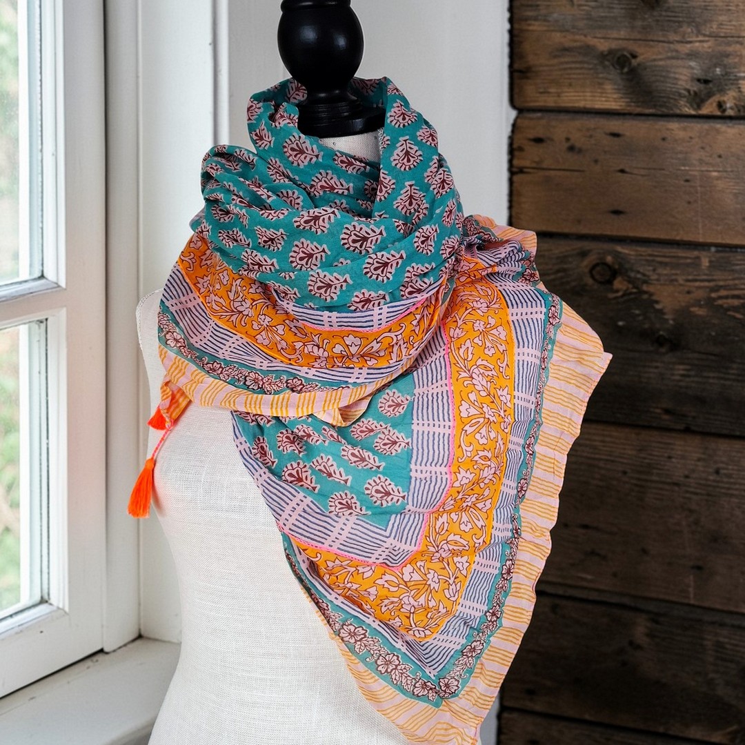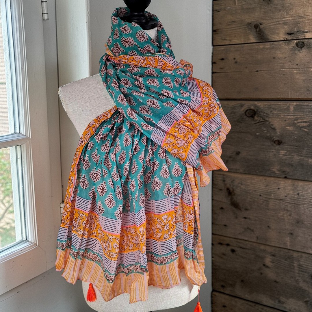 Unsere Schals sind per Hand bedruckt (Blockprint) dadurch gibt es Farbüberlagerungen, diese Überlagerungen sind keine Fehler sondern ein Zeichen von Handarbeit.