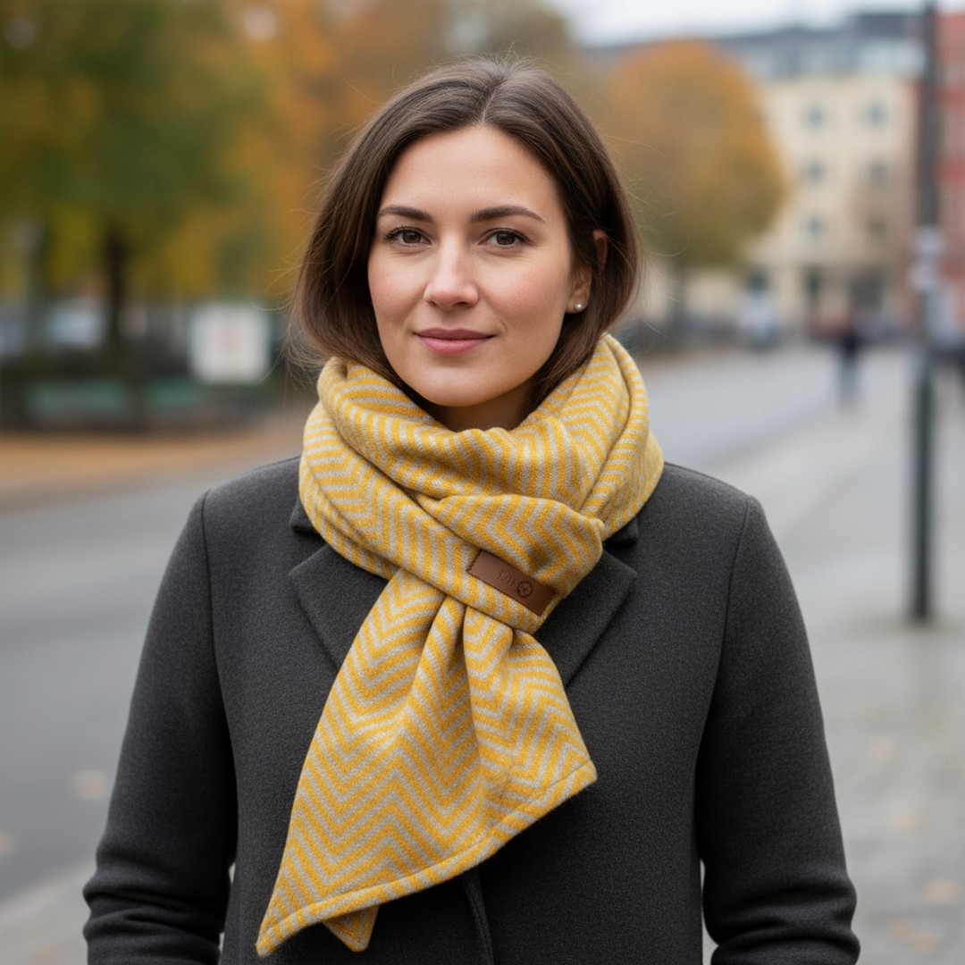 - Der Schal auf 1 Seite mit Fischgrätenmuster OCKERGELB – HELLGRAU auf der anderen Seite ist er uni OCKERGELB